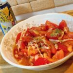 - ニンニクから香りが出てきたら豚肉80g、みりん小さじ2、酒小さじ2、塩胡椒適量を入れてさらに炒める。